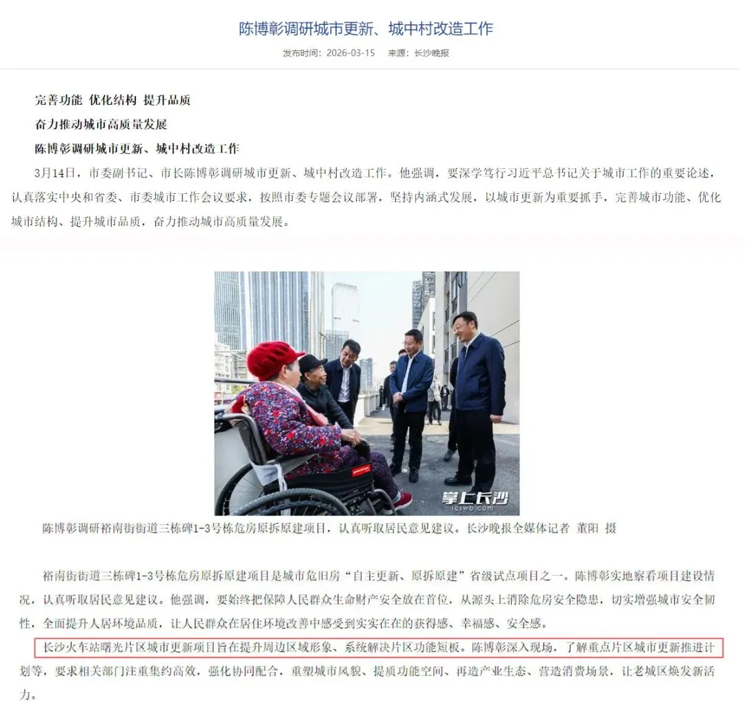 3月14日,长沙市委副书记、市长陈博彰来到火车站曙光片区城市更新项目进行实地调研。
