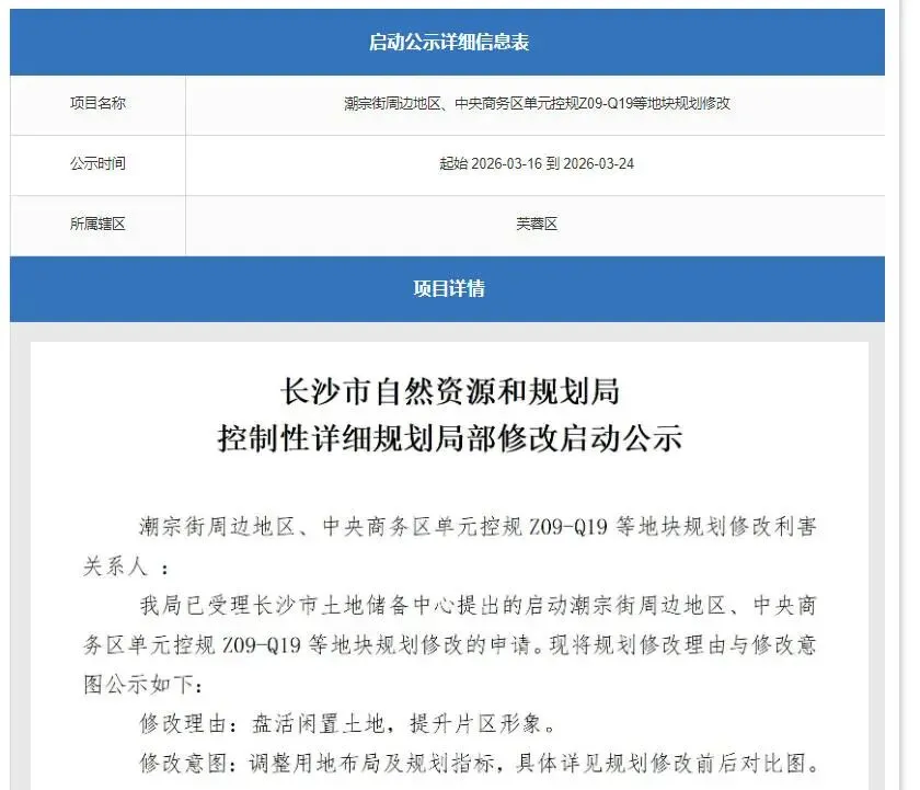 值得一提的是,3月16日,长沙市自然资源和规划局公布潮宗街周边地区、中央商务区单元控规Z09-Q19等地块规划修改。