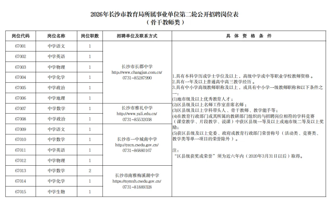 根据《事业单位人事管理条例》等有关规定,经研究决定,长沙市人力资源和社会保障局会同长沙市教育局对其所属29个事业单位开展2026年第二轮教职工公开招聘工作。本次招聘计划为226名,招聘对象为公费师范生、高校毕业研究生、骨干教师、学科竞赛教练和体育教练员。编制使用计划经中共长沙市委机构编制委员会办公室批准。现将有关事项公告如下: