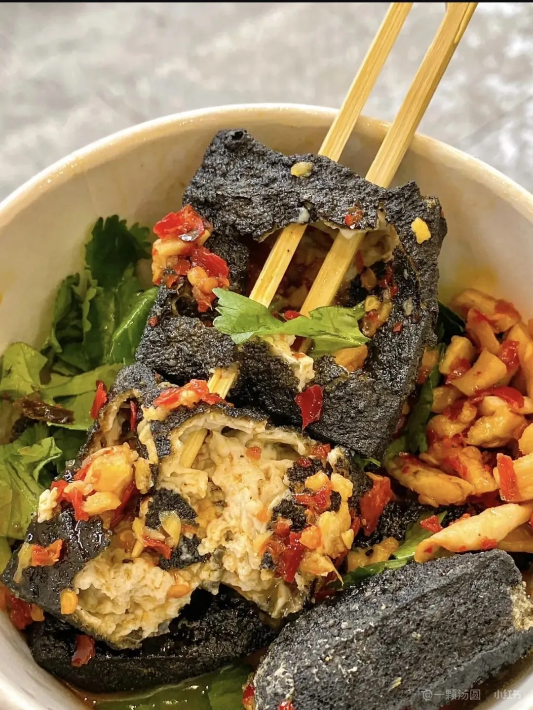 • 臭豆腐:外皮酥脆,内里嫩滑,灌满汤汁,闻着臭吃着香