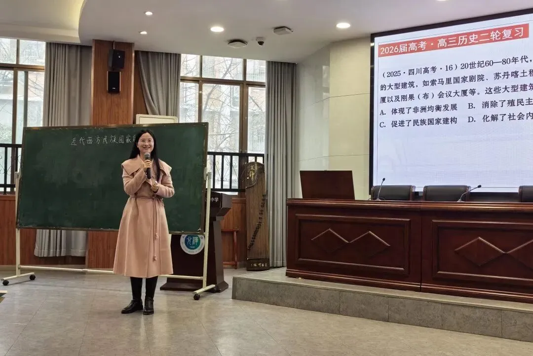 示范课展示环节,彭丹老师上了《近代西方民族国家的形成》一课。课堂以高考真题导入,引导学生从概念界定、形成过程及中西比较等维度构建立体化知识体系,通过精选史料设置问题情境,培养学生解决复杂问题的能力。黄敏兰老师在点评中指出,二轮复习应聚焦核心概念与高频考点,在知识建构上建立点、线、面结合的立体结构,在能力培养上以“以练代讲”为主,通过问题情境实现能力提升。