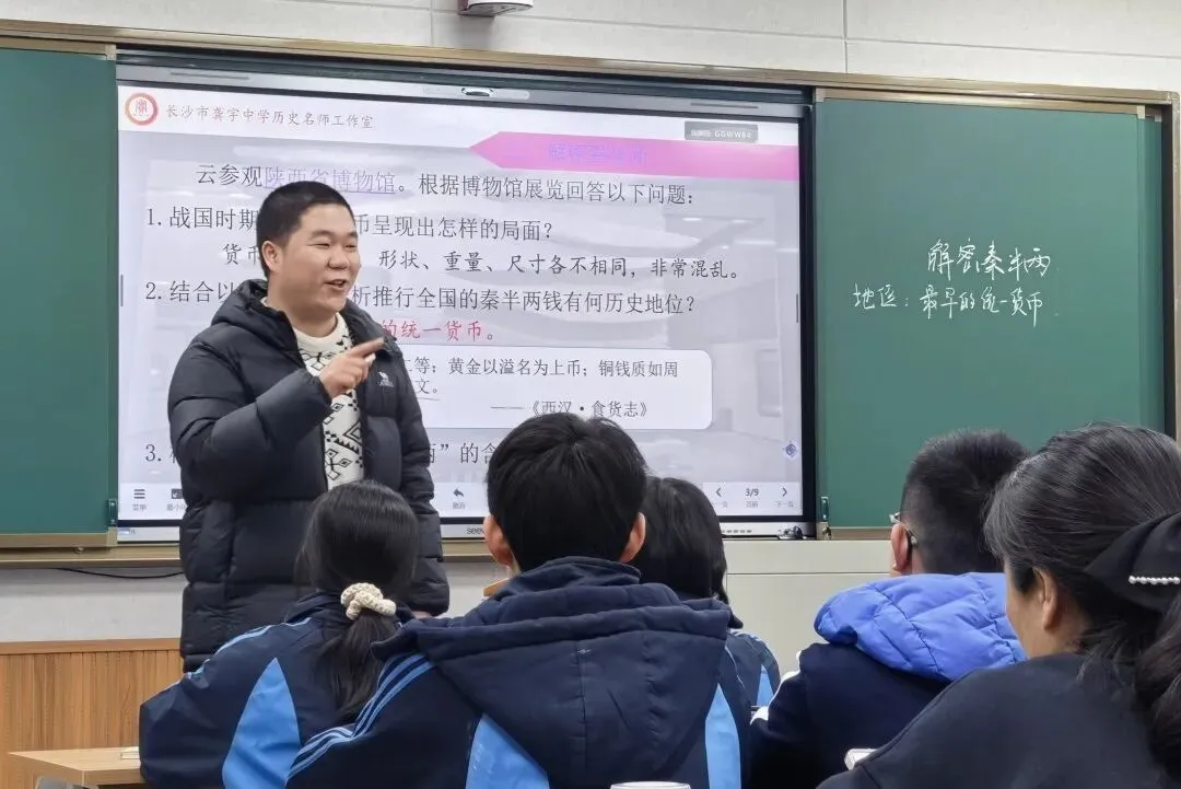 课例展示环节,谷建明老师以《端午节的起源》为题,从“测一测端午知多少”引入,引导学生辨析“纪念屈原说”的古文疑点,通过史料解读自主建构对节日起源的认识。武炎老师以《解密秦半两》为题,组织学生“云参观”陕西省博物馆,围绕战国货币混乱局面、秦半两的历史地位、统一背景等问题层层设问,通过史料辨析帮助学生理解货币统一的意义,落实史料实证与历史解释等核心素养。