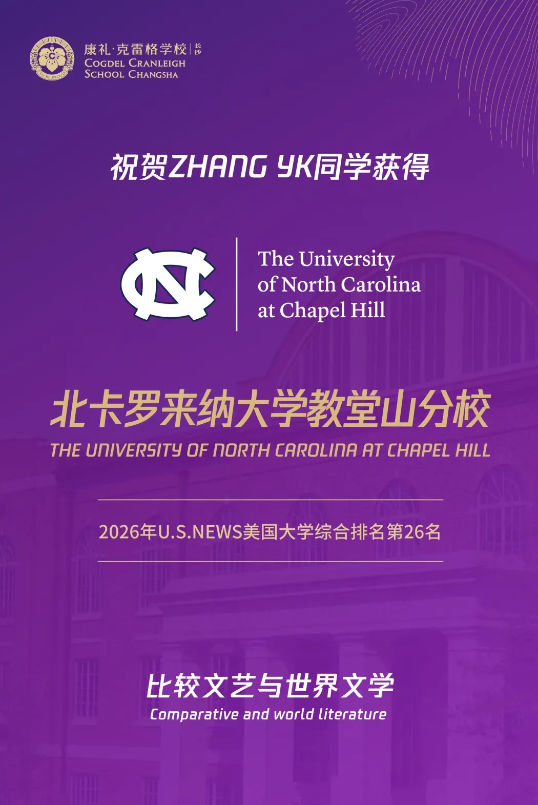 热烈祝贺我校ZHANG YK同学脱颖而出,成功斩获北卡罗来纳大学教堂山分校(UNC Chapel Hill)比较文艺与世界文学专业录取offer!这份录取不仅是对学生个人学术能力、专业积淀与综合素养的高度认可,更是康礼在顶尖美本申请赛道上的又一里程碑式成果。