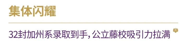 与此同时,康礼学子在加州大学系统申请中同样表现亮眼,一举斩获加州大学圣芭芭拉分校(UCSB)11封、加州大学戴维斯分校(UCD)11封、加州大学欧文分校(UCI)10封,共计32封加州系顶尖公立录取,用一份份亮眼的offer,印证加州系公立“藤校”的硬核吸引力,展现康礼学子在美本申请中的群体优势。