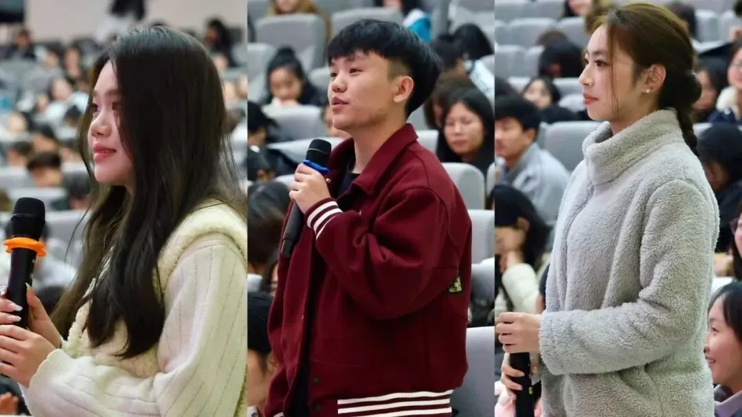 “作为即将毕业的学姐,又荣获多项荣誉,你对在校的学弟学妹有哪些寄语?”肖思源以对话形式与三位获奖同学亲切互动。一问一答间,励志奖学金获得者刘姝慧、创新创业代表孟洋鑫、国家奖学金获得者钟婧欣背后的故事逐一呈现——她们或身处单亲家庭或经历单招落榜、职场漂泊,始终向阳而生、克难奋进、逐光而行。同学们对她们科学规划学业、勇敢战胜困难的成长历程,有了更真切深刻的理解与感悟。