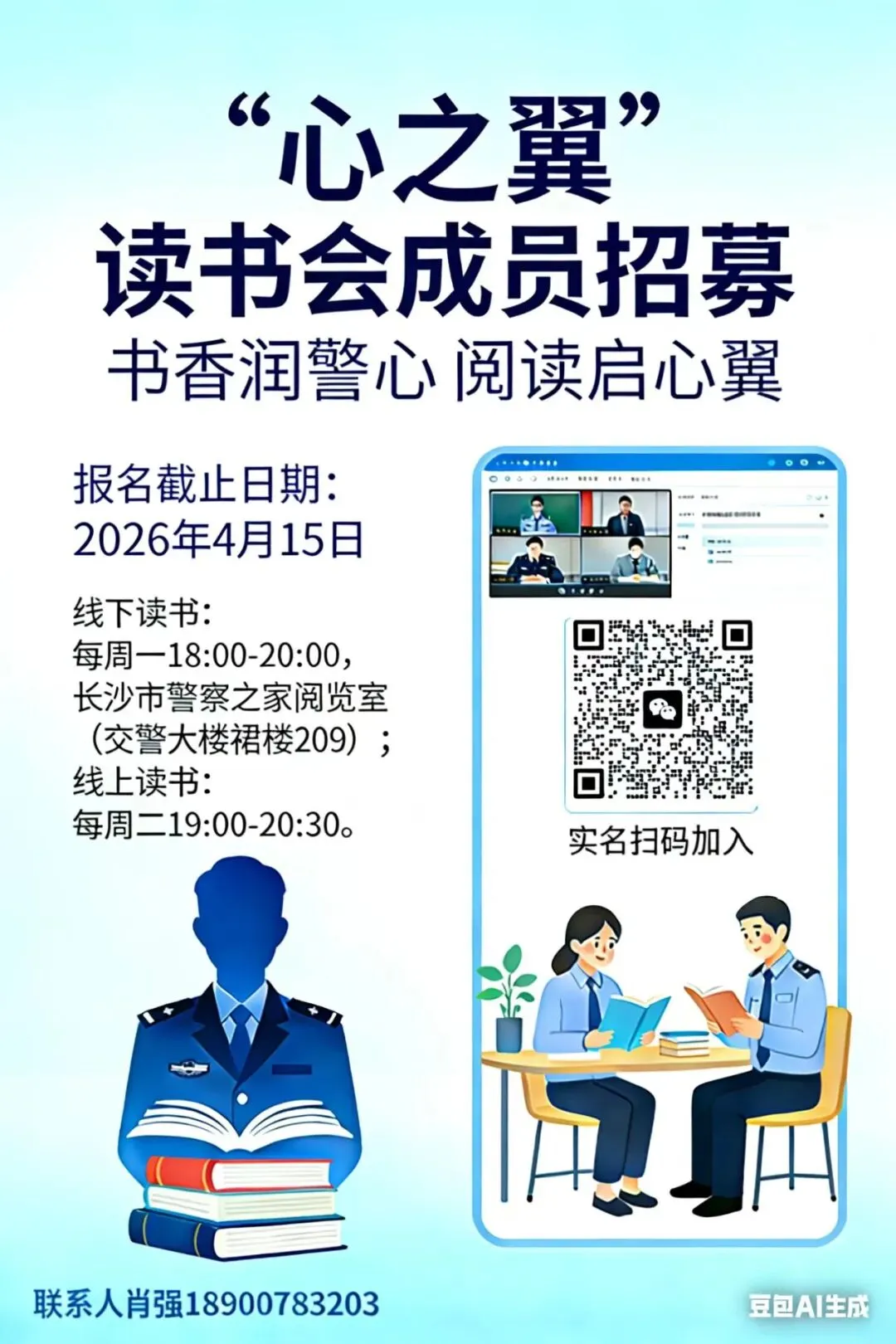 为深入推进警营文化建设,加强民辅警人文关怀和心理疏导,丰富精神文化生活,缓解职业压力,提升队伍凝聚力、向心力和战斗力,长沙市警察协会拟联合交管支队分会开展“心之翼”读书会活动。