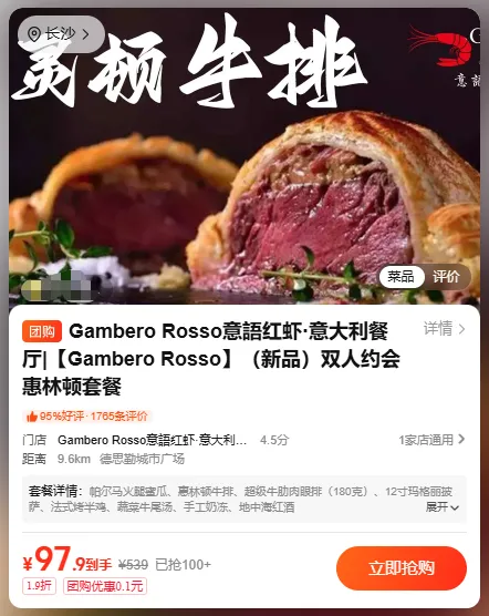 长沙Gambero Rosso意語红虾~新品福利 双人约会惠林顿套餐!门市价539仅需97.9抢.德思勤店