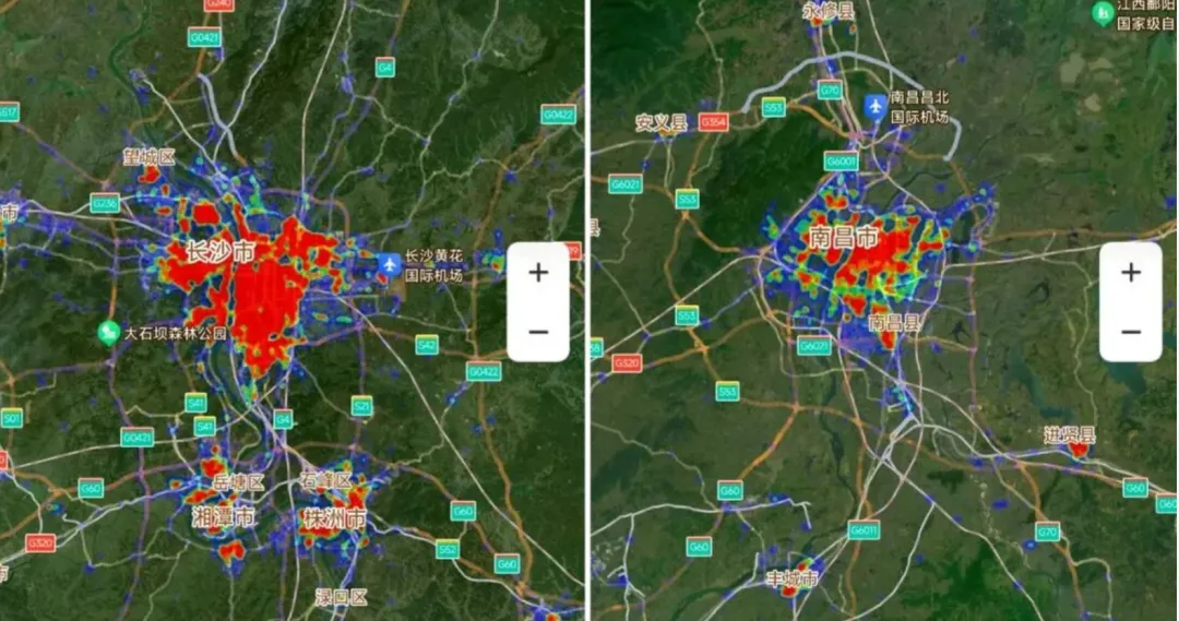 然而观察城市热力图大家会发现长沙的市区面积只是略大于南昌。长沙市区看起来更加拥挤,相比之下南昌市区布局更加宽松舒适。因此长沙市区外扩速度还是有待加强,只有这样人口密度才会适中,要不然整个城市都是红红的一片。
