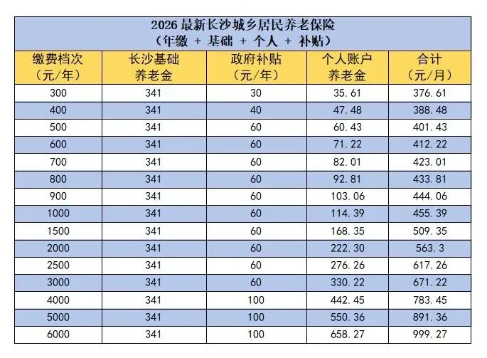1. 基础养老金:2026年长沙全市统一标准为341元/月,自2010年以来已从60元/月逐步上调至现在的标准,未来会随经济水平继续上调。