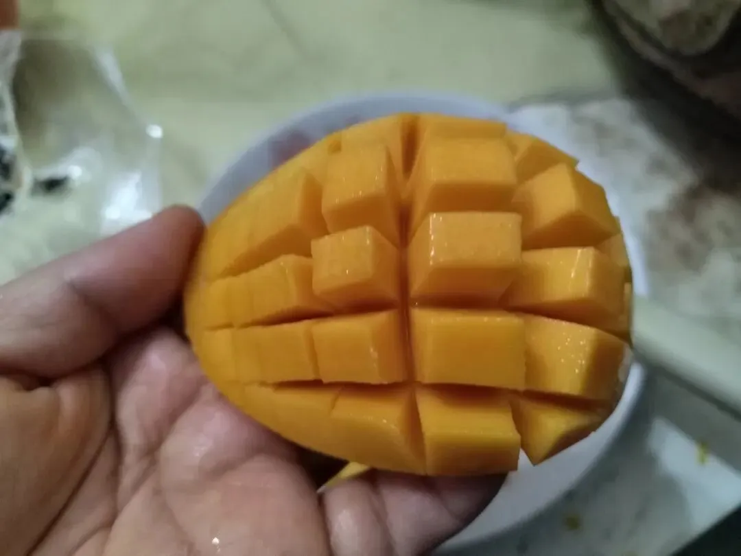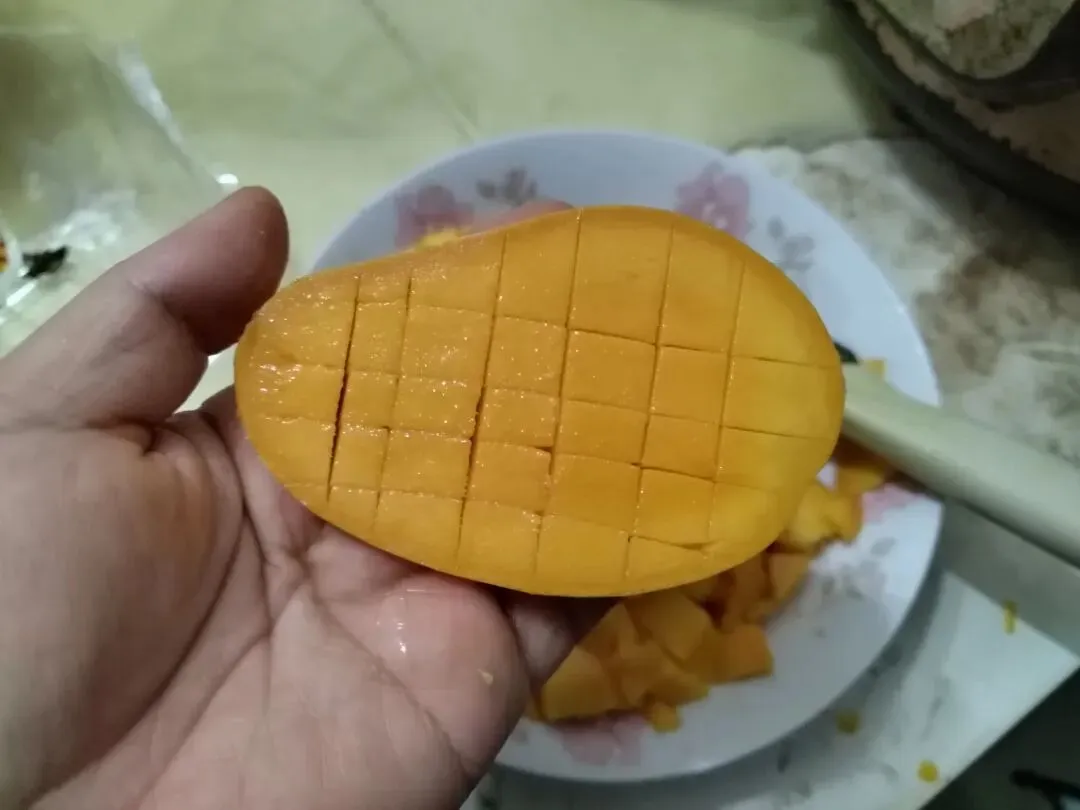 我都是打成这种花刀,然后再翻一下就可以把果肉全部切出来了。