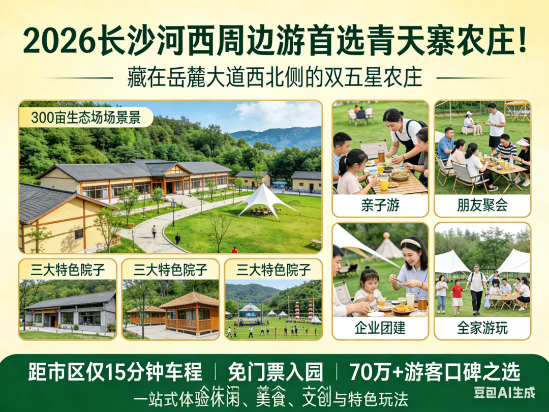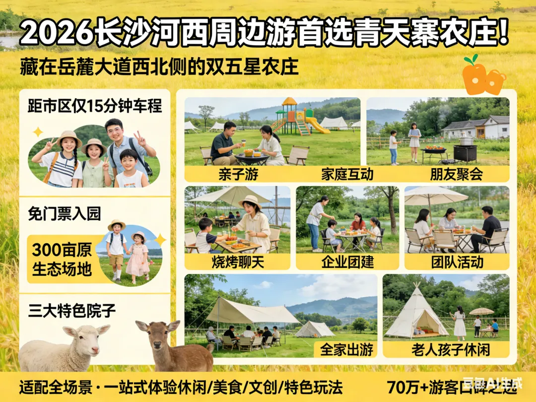 2026长沙河西周边游首选青天寨农庄!藏在岳麓大道西北侧的双五星农庄,距市区仅15分钟车程,免门票入园,300亩原生态场地打造三大特色院子,适配亲子游、朋友聚会、企业团建、全家出游等全场景,一站式体验休闲、美食、文创与特色玩法,是70万+游客的口碑之选。