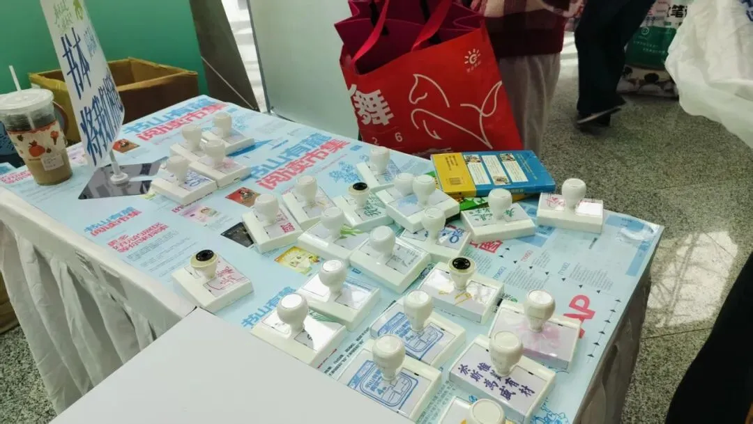 我才一进门,就被这印章给吸引住了。有“0731灵气闪耀”、“翻书阅岭”、“朱张会讲”、“长沙”、“春天正是读书天”、“我在麓山读书”、“岳麓书会”、“书山有麓阅读市集”、“阅有滋味庆祝日常”------花花绿绿的,漂亮极了。不光是我,也有几位朋友,凑了过来,拿出专门来盖章的本子,一个个印章很认真地盖着。