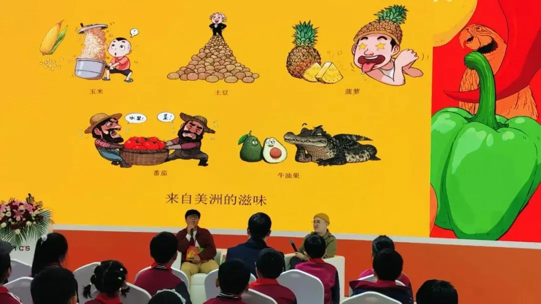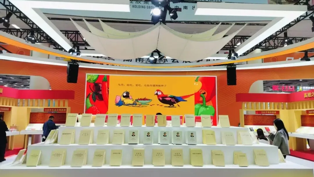 大厅中央,正在进行新书发布会。不知道是新发行什么书,没有细看。但是一定跟辣椒有关。因为展厅架子上挂着“湖南人能吃辣椒会出书”,展厅中央的屏幕上,展示的,正是鸟类能吃、爱吃辣椒,还能传播辣椒种子。