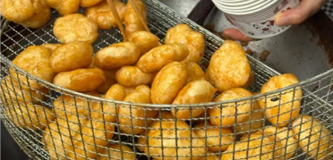 长沙人还做油炸哪吒,新鲜的莲藕打成泥,现搓成球,直接下锅油炸,本地人排队抢着吃这份香香酥酥的脆皮藕圆子。