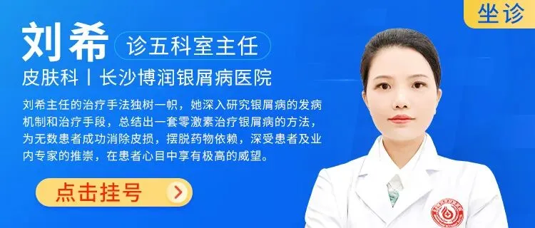 长沙博润银屑病医院刘希副主任医师,深耕银屑病诊疗多年,擅长寻常型、红皮型、脓疱型等各类银屑病,尤其擅长反复发作、久治不愈病例,坚持零激素、个性化诊疗方案,深受患者信赖。