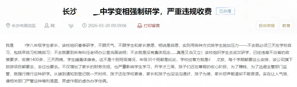 近日,有长沙的学生家长在问政平台上留言,投诉学校存在变相强制研学、严重违规收费行为。这位家长反映称,其为雨花区某中学的八年级学生,学校组织春季研学,说是“自愿”,却用各种方式给不报名参加的学生施加压力,迫使他们参加。如:不去的学生必须三天在学校自习,包括早自习和晚自习;要到所有科任老师办公室当面说明;被批评没有集体观念……且学校此次组织学生去武汉研学,已经违背研学不出省的政策要求,收费还要1400多元,期间的三天两晚学生都是睡集体宿舍。他(她)表示,学校此举不仅增加了家长的财务负担,也严重影响学生学习,要求主管部门管一管。该校2026年春季研学活动目前处于意向调研阶段,学校明确遵循自愿原则。但调研过程中个别教师沟通方式不当,客观上给学生、家长造成压力,我局已责成学校规范工作方式,严禁任何变相强制行为。同时,已要求学校严格遵守省市关于研学实践的相关规定,科学确定活动内容、收费标准及行程安排。下一步,我局将持续跟踪督促,确保活动组织合理合规。应该说,适当开展研学活动是有必要的,不仅可以有效缓解学生的学习压力,帮助学生调整学习状态,还可以让学生增长见识,扩大视野,锻炼身体和意志,以及动手能力、团队精神、社交能力等。正因为如此,教育部门才鼓励学校组织研学活动,但前提是依法依规,要充分尊重学生及家长的意愿,让他们自主决定是否参与研学。在这件事情上,相关教师的出发点是好的,希望全体学生都参与,这样更能体现班级的团队精神和集体观念,只是在沟通时使用了不恰当的言辞和语气,导致一些学生和家长产生了误解,也反映了这些教师的工作能力有待加强,今后在推进工作的同时,充分尊重学生及家长的权益,以避免类似误会的产生。当然,那些不准备参与研学的学生及家长也应该搞清楚,研学不等于放假,而是学校教育的重要组成部分,即便不参与研学,除非有伤病请假等特殊情况,依旧需要在学校进行常规学习的。所以学校要求不参与的学生在研学期间必须在学校自习,并不是变相强制研学,而是正常的教学安排。