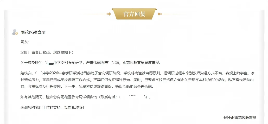 长沙一学校被投诉变相强制研学,教育局:个别教师沟通方式不当