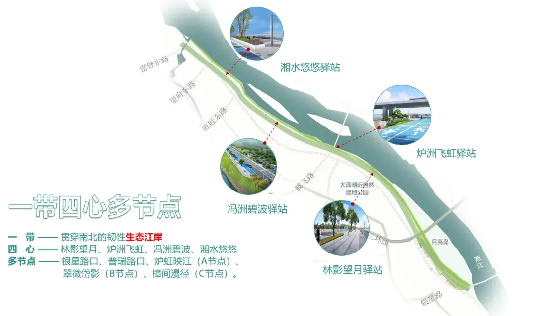 项目以 “一带四心多节点” 为整体规划,打造贯穿南北的韧性生态江岸,其中 “四心” 正是湘水悠悠、冯波碧洲、炉洲飞虹、林影望月四大观景平台,而此次启动招商的 4 座城市智慧驿站,正是四大观景平台的核心配套设施,为风光带注入满满的便民与精致感。