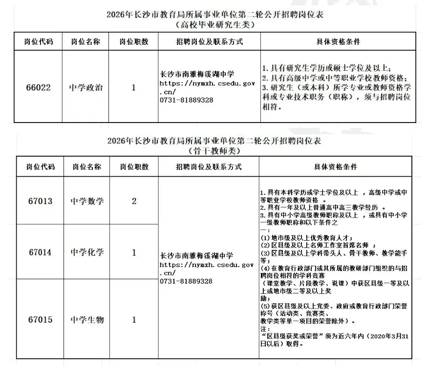 长沙市南雅梅溪湖中学2026年第二轮公开招聘研究生、骨干教师公告