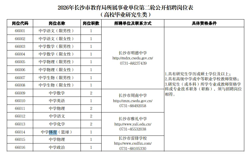 2.《2026年长沙市教育局所属事业单位第二轮公开招聘岗位表(高校毕业研究生类)》