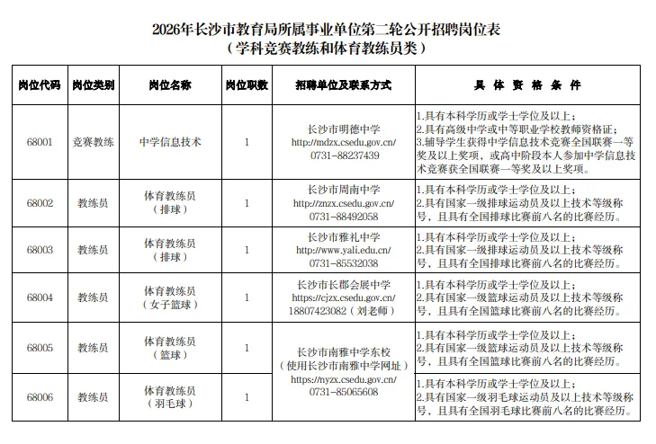 4.《2026年长沙市教育局所属事业单位第二轮公开招聘岗位表(学科竞赛教练和体育教练员类)》