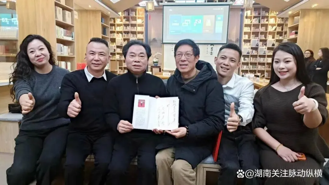 (中国“金话筒”奖获得者、湖南卫视著名主持人李兵(右3)等嘉宾与作者合影留念)
