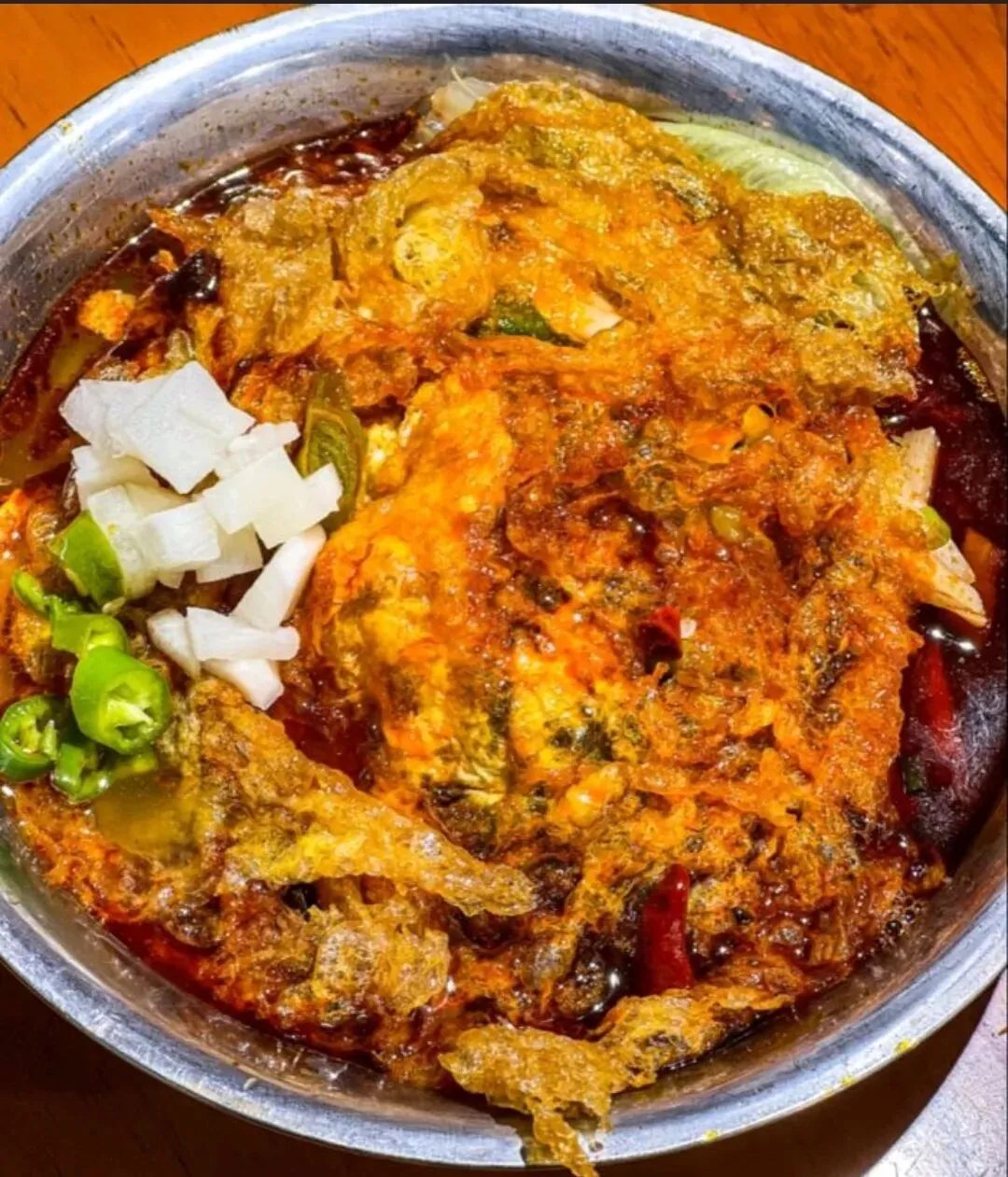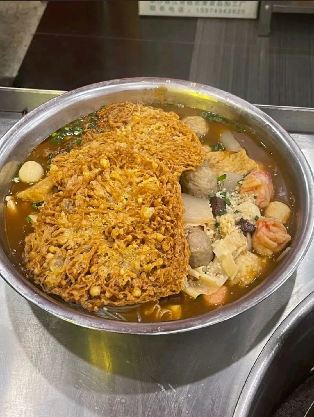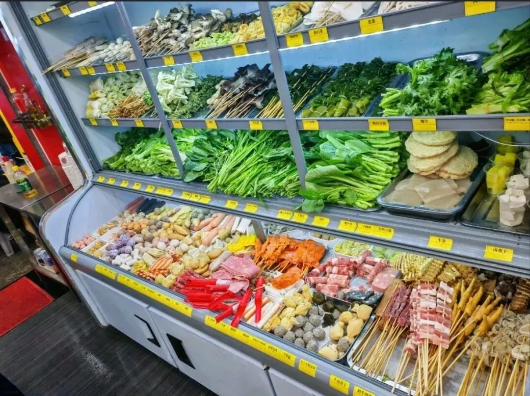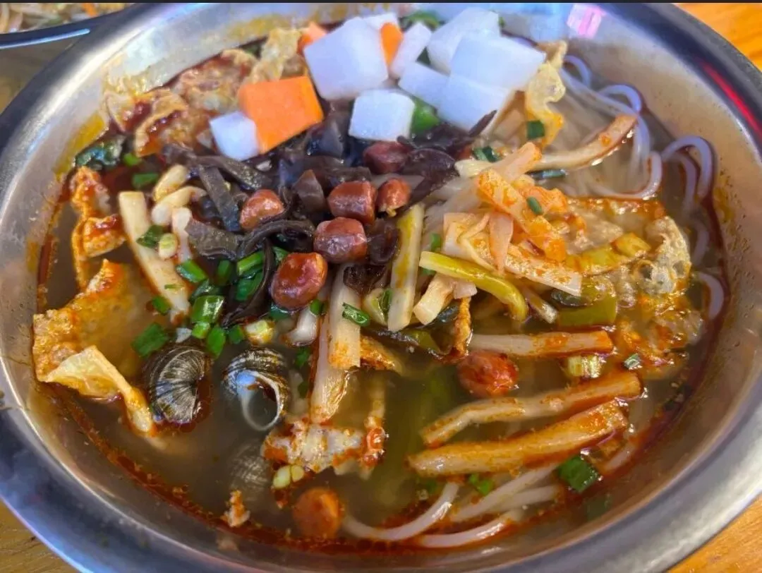 他们家的汤底是灵魂。大骨熬足六个小时,加上秘制的麻辣底料,入口先是麻,辣味在后头慢慢涌上来,但不烧胃,反而让人一口接一口停不下来。荤素自选,我最爱的搭配是:嫩牛肉、藕片、金针菇、土豆粉,再加一份炸豆皮。炸豆皮下锅几秒就软了,吸饱汤汁,咬下去满口鲜香。