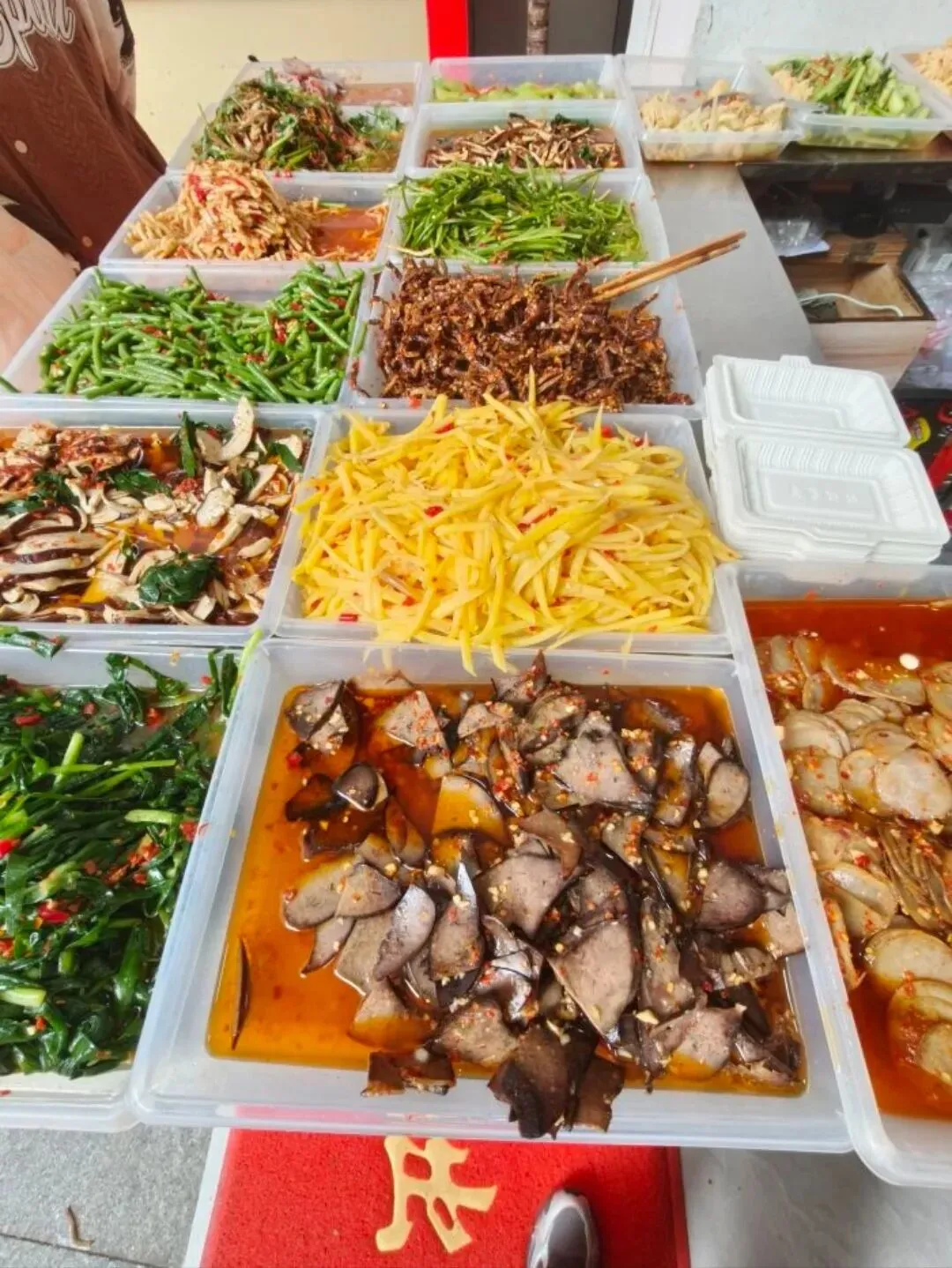 价格也很接地气——两种菜品拼一盒5元,三种菜品拼一盒10元。不过有个不成文的规矩:想买只能搭着买,单买一样不卖,其实也是为了让每个顾客都能吃到。