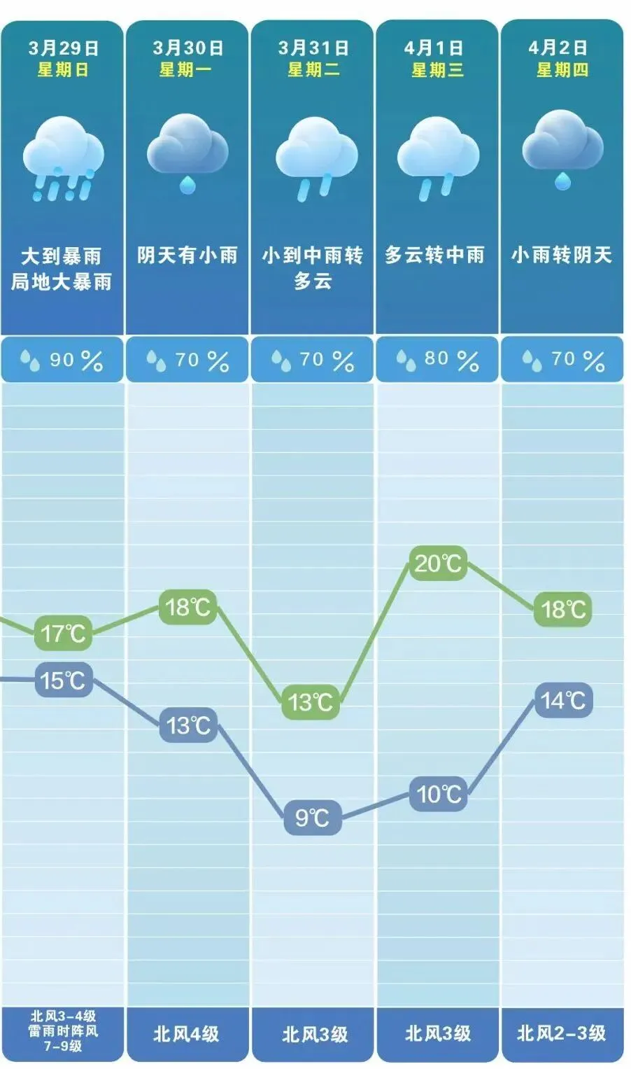 今天至明天白天,小雨转大雨,城区南部、长沙县南部、浏阳南部暴雨,北风3级、雷雨时阵风7~9级,14~17℃;