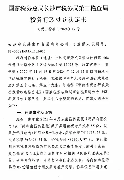 我局对你单位(地址:长沙高新开发区桐梓坡西路408号麓谷林语小区I区综合体3栋12003房,法定代表人:曾世豪)2020年11月19日至2024年12月31日期间骗取出口退税情况进行了检查,现根据《中华人民共和国行政处罚法》第五十七条、第五十九条,并遵循《湖南省税务行政处罚裁量权实施办法》(国家税务总局湖南省税务局公告2021年第5号)第三条、第二十六条规定的原则,作出处罚决定如下: