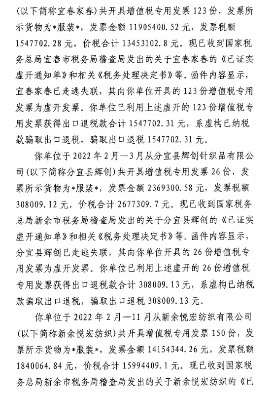 你单位于2022年2月-11月从新余悦宏纺织有限公司(以下简称新余悦宏纺织)共开具增值税专用发票150份,发票所示货物为*服装*,发票金额14154344.26元,发票税额1840064.84元,价税合计15994409.1元。现已收到国家税务总局新余市税务局稽查局发出的关于新余悦宏纺织的《已证实虚开通知单》和相关《税务处理决定书》等。函件内容显示,新余悦宏纺织已走逃失联,其向你单位开具的150份增值税专用发票为虚开发票。你单位已利用上述虚开的150份增值税专用发票获得出口退税款合计1840064.60元,系虚构已纳税款骗取出口退税,骗取出口退税1840064.60元。