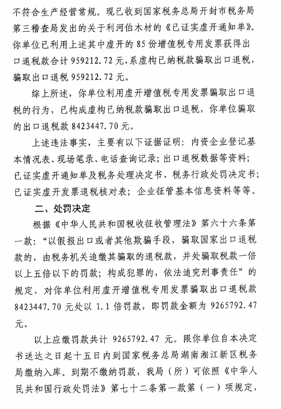 以上应缴罚款共计9265792.47元。限你单位自本决定书送达之日起十五日内到国家税务总局湖南湘江新区税务局缴纳入库。到期不缴纳罚款,我局(所)可依照《中华人民共和国行政处罚法》第七十二条第一款第(一)项规定,每日按罚款数额的百分之三加处罚款。