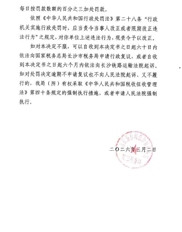 如对本决定不服,可以自收到本决定书之日起六十日内依法向国家税务总局长沙市税务局申请行政复议,或者自收到本决定书之日起六个月内依法向长沙铁路运输法院起诉。如对处罚决定逾期不申请复议也不向人民法院起诉、又不履行的,我局(所)有权采取《中华人民共和国税收征收管理法》第四十条规定的强制执行措施,或者申请人民法院强制执行。