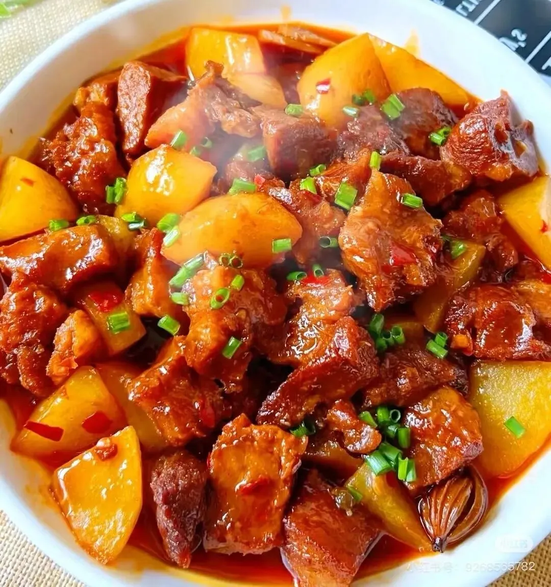 土豆烧牛腩、雪里红肉沫、红枣蒸南瓜、清炒齐心白、紫菜蛋汤。