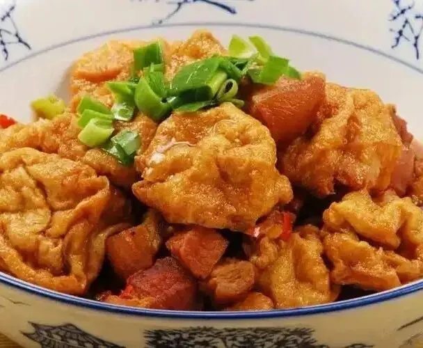 猪脸肉40克、蒜苗70克、大红椒90克、猪肉38克、云耳3克、豆腐55克、包菜90克、鸡蛋10克、西红柿20克。