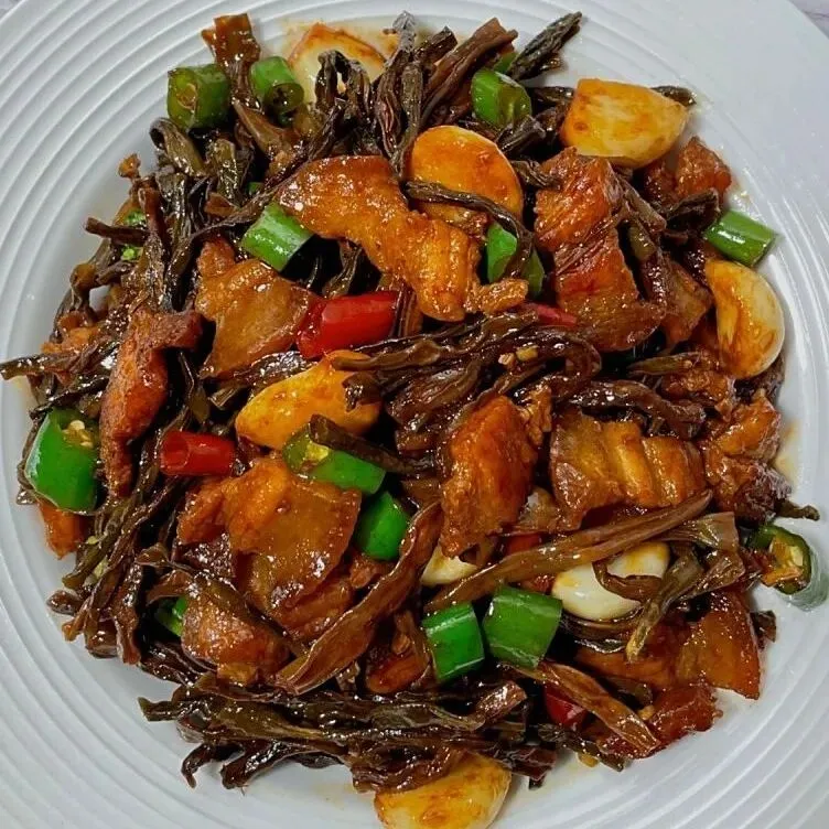 五花肉85克、梅菜20克、大青椒25克、香干60克、猪肉28克、南瓜110克、白萝卜100克、皮蛋10克、黄瓜20克。