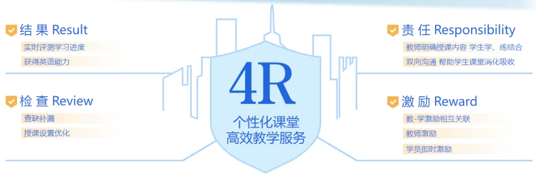 4R个性化课堂:4R代表着Result (结果)、Responsibility (责任)、Review (检查) 和Reward (激励)。四者有机结合,形成“以结果为起点,又以结果为归宿” 的科学、实用的系统。