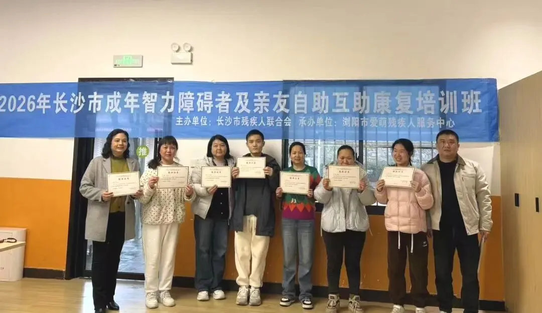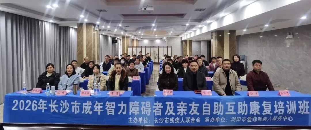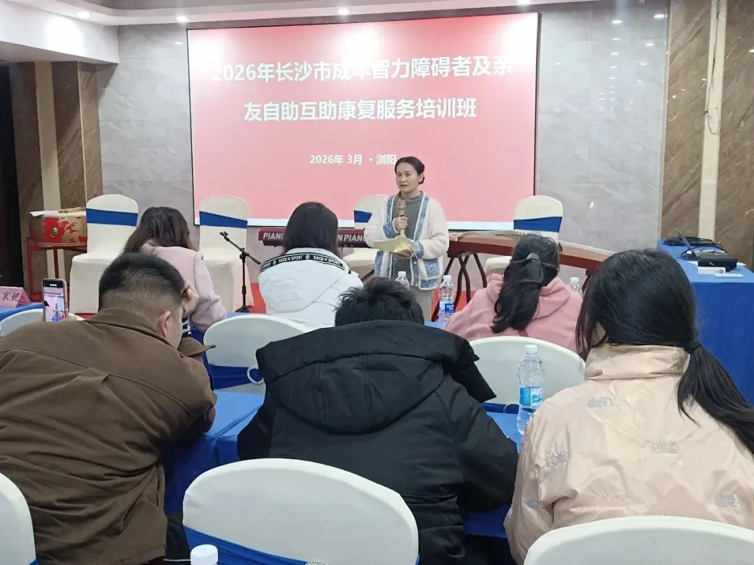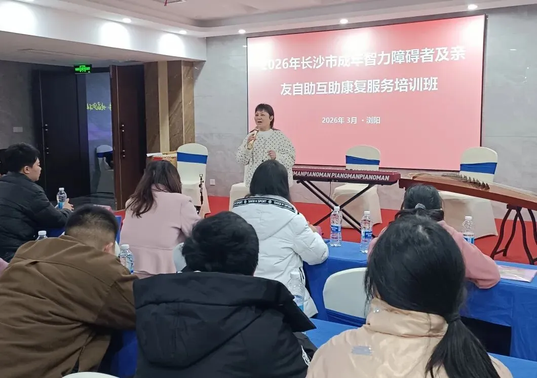 2026年3月24日,由长沙市残联主办,浏阳市爱萌残疾人服务中心承办的“成年智力障碍者及亲友自助互助康复服务培训班”在浏阳市南洋新天大酒店正式开班。40余名成年智力障碍者与亲友及长沙市康复机构骨干共同参与。