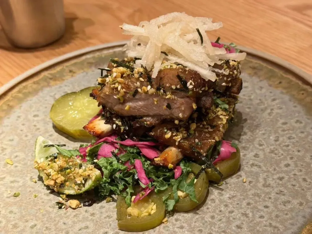 先说低温慢烤带骨雪花牛小排,我点的是七分熟。本来对这道期待值还蛮高,结果上桌一切开,状态有点尴尬:外层略微偏老,切的都有点小费劲,里面又还带着比较明显的血水,熟度和口感都没卡在一个很舒服的点上。不是不能吃,但确实没有那种“这一口值回票价”的感觉,甚至有点小拉垮。