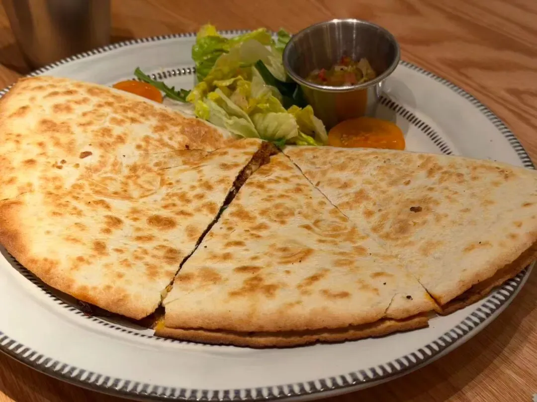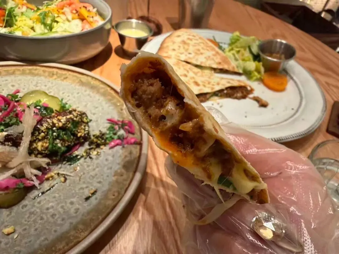 不过也不是全场都在掉分。加州辣味牛肉薄饼还不错,本芝士脑袋狂喜,那个浓厚的拉丝太深得我心。饭搭子不爱奶味、起司味道,但是也吃了好几片,这个辣味把奶味中和了很多,不会很齁,属于上桌后大家都能顺手多吃两块的类型。