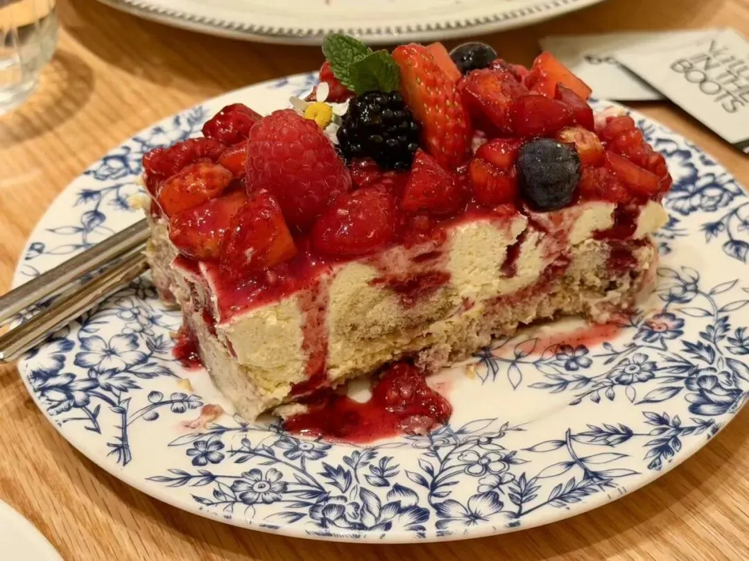 杂莓提拉米苏我也会推荐,莓量饱满,奶油厚实,不是冻柜里的成品,酒味也适中,算是最近吃的提拉米苏里的前几名了。唯一不足可能是果酱甜了少许。