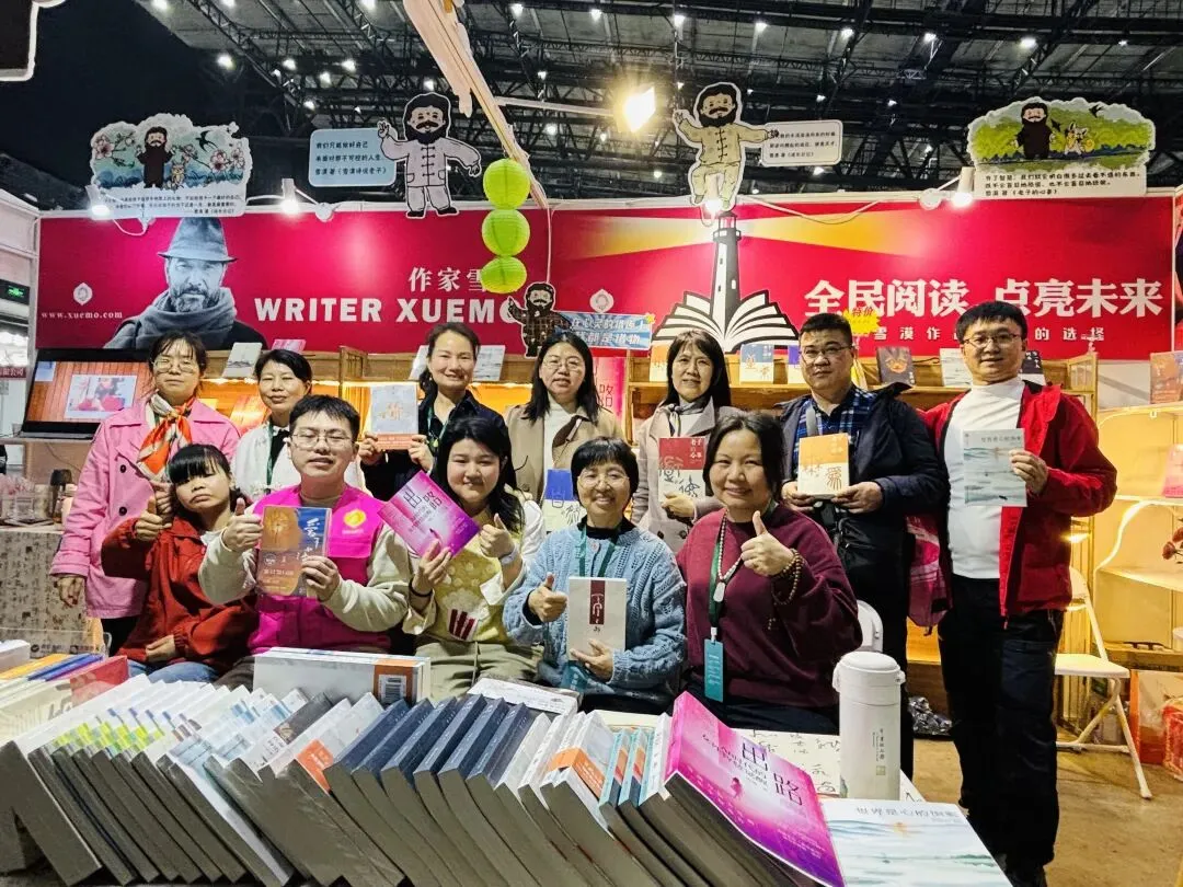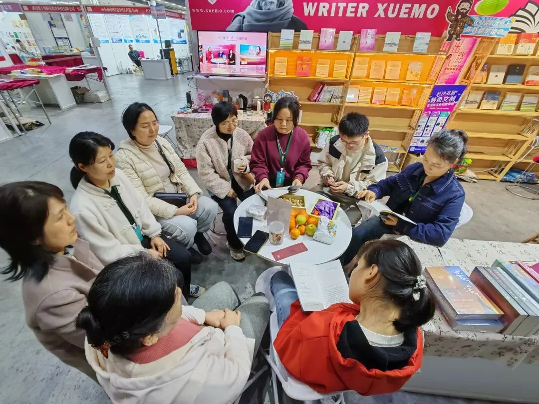 我们的展位也是在二楼,是在靠边的位置,别的展位都忙着撤展了,而我们的展位开始响起了朗朗的读书声,真是一群爱读书的人,因为共同的爱好,所以我们是从五湖四海聚到了这里。我们的读书声引来了旁边展位的老板,余磊帅小伙老师大爱,送了他一本小说《白虎关》。