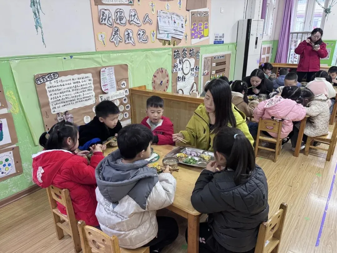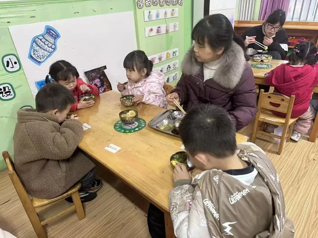 家长委员们与幼儿并肩而坐,感受幼儿日常用餐的氛围,品尝着营养美味的餐食。