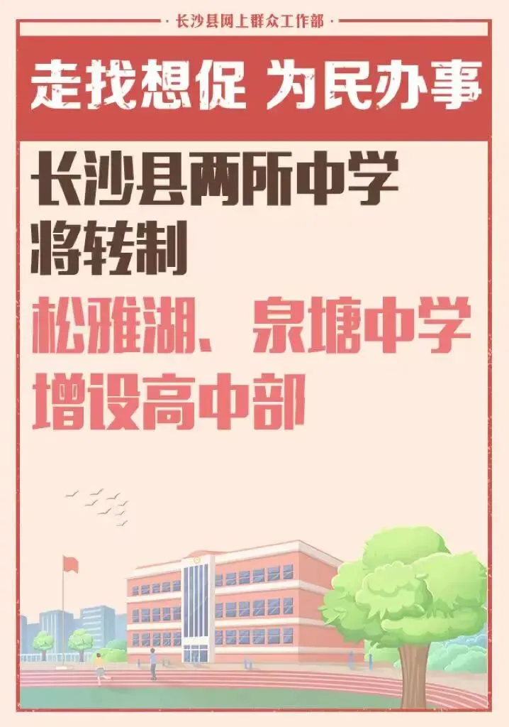 A:长沙县教育局:根据长沙县2026年《政府工作报告》任务部署,松雅湖中学、泉塘中学将于2026年秋季转制为完全中学,增设高中部并启动招生。长沙县是按照上级批复和有关文件要求补充高中教师,目前暂无相关批复。长沙县教师招聘公告及教育人才引进公告均会通过“星沙人才网”等官方网站进行公布。