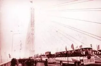 这张人山人海的照片,是通车典礼那天,警车开道,后面十几辆轿车一排排地上路,围观的人把道边站得满满登登,大家伙儿都想凑个热闹,那个年代的自行车、摩托、苏式机关车都混在一起,谁家小孩跟着爸妈去看,回来一晚上合不上嘴,感叹长沙真大真热闹。