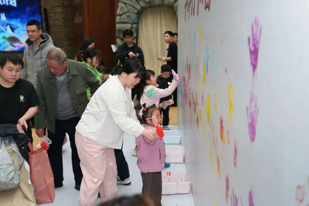 “我选了红色,因为今天我很开心!”一名小男孩举着沾满红色颜料的双手,神情中满是兴奋。家长们也纷纷参与其中并表示,“这面墙不仅是一幅作品,更是我们和孩子心与心相连的见证。”