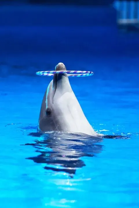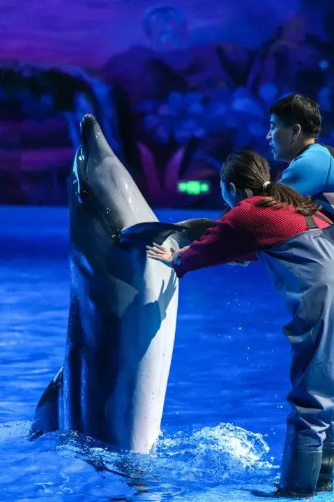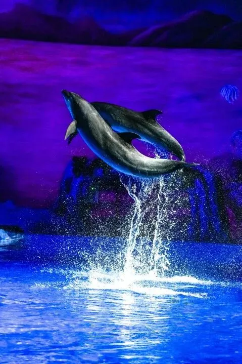 随后,孩子们来到海豚剧场,期待已久的海豚表演拉开帷幕。随着驯养师的指令,几只海豚跃出水面,划出优美的弧线,引得孩子们阵阵欢呼。