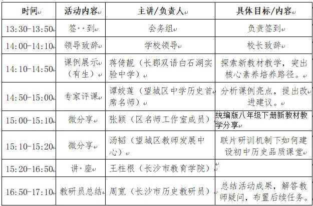 为贯彻落实《义务教育历史课程标准(2022年版)》,深化统编版初中历史教材的理解与应用,提升长沙市初中历史教师的教学能力与专业素养,长沙市教育科学研究院决定组织本次新教材研训活动,该活动和望城区历史名师工作室的月度教研一起开展,助力教师掌握教材核心内容及教学方法。现制定活动承办方案如下:
