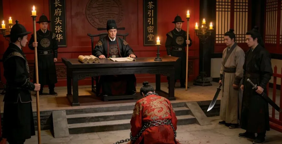 长沙府衙正堂,案几森严,烛火高悬。捕头张华身着官服,面容方正,双目如炬,端坐主审位上,两侧衙役持棍肃立,堂下阶前,沈砚被铁链锁身,瘫跪于地,大红蟒袍染血污,不复昔日嚣张,唯有眼底仍藏着阴鸷的狠光。