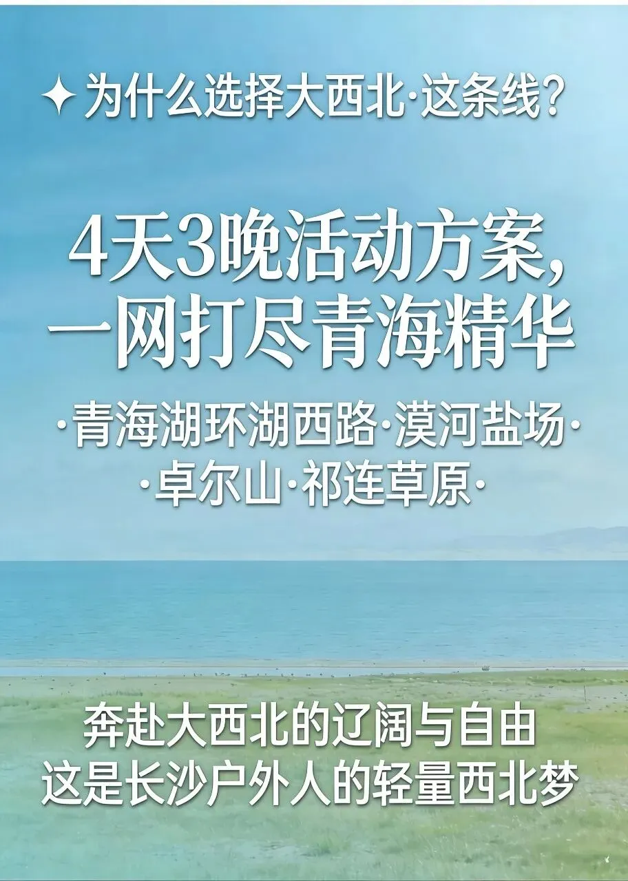 青海湖环湖西路: 青海湖颜值天花板,未过度开发的原生湖段,海拔3200m,公路紧邻湖岸,湖水湛蓝澄澈,草原连绵环绕,可近距离亲水漫步,避开商业景区人潮,是青海湖观景拍照的绝佳路段。 漠河盐场: 本地户外团专属野盐湖,海拔3050m,被誉为茶卡平替,免费开放,盐滩洁白无垠,无风时湖面如镜,倒映蓝天雪山,无商业化打扰,轻松拍出天空之镜氛围感大片。 日月山: 海拔3520m,黄土高原与青藏高原分界线,经幡、玛尼堆遍布,是进入青藏高原的标志性打卡点,可感受高原农牧区的自然与人文分界。 卓尔山: 祁连山脉的“颜值担当”,丹霞地貌红褐如画,脚下是碧绿的草原,远处是皑皑雪山,登山顶观景台可俯瞰全景,日落时分,夕阳将山体染成金色,光影交错间,尽显大西北的壮阔与柔美,木栈道轻徒步,轻松不累还能沉浸式赏景。 祁连草原+大冬树山垭口: 祁连草原海拔2700m,中国六大最美草原之一,春日草原渐绿,牛羊成群,旷野感十足;策马驰骋在辽阔的草原上,风拂过发梢,是独属于大西北的自由感,周边经幡阵、雪山相映,随手拍都是公路大片,还能体验藏服拍照、射箭,感受草原儿女的豪情。大冬树山垭口海拔4120m,此行最高点,经幡阵迎风飘扬,雪山连绵,是高原标志性打卡地。说明:图片均来自于网络,如侵权,请联系删除。